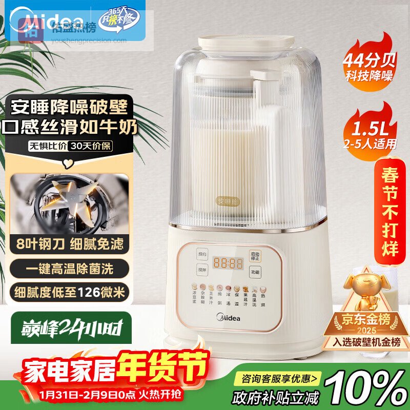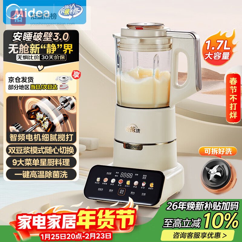 美的(Midea)破壁机豆浆机家用可拆洗1.75L榨汁机安睡Max低音料理机3-5人高温除菌洗辅食果汁机MJ-PB1S1年货¥