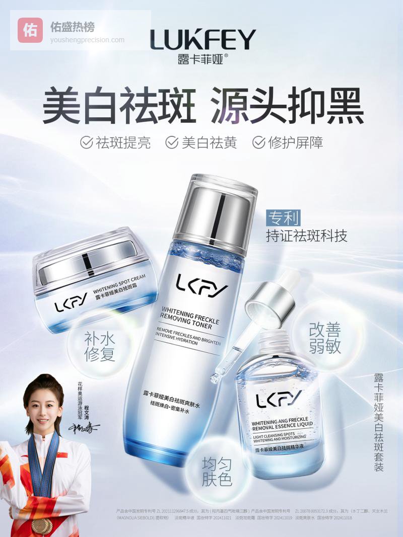 我用了大概两周,明显感觉肤色透亮了,那些陈年痘印和刚冒出来的晒斑都淡了一圈,最惊喜的是连那种边缘模糊的黄褐斑都开始变浅变散,整张脸干干净净的。而且这套还是花样游泳奥运冠军程文涛女士代言的,国妆特字编号也都给得明明白白(爽肤水:202411018,精华液:202411021,祛斑霜:202411019),用着特别踏实,完全不担心是那种三无产品。