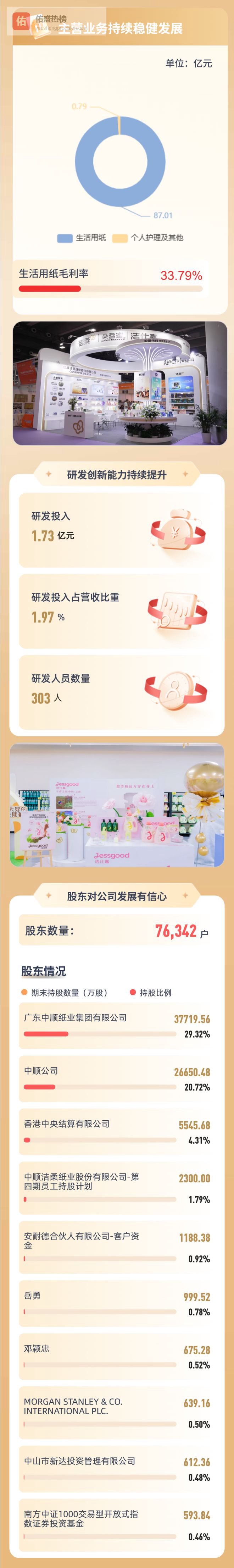 生活用纸作为公司的核心业务,报告期内实现营业收入87.01亿元,毛利率为33.79%,同比提升3.33个百分点。公司聚焦用户需求,落实产品领先战略,进一步巩固市场核心竞争力。