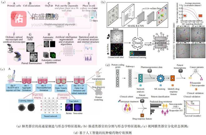 自动化系统正逐步取代传统的人工操作,不仅显著提高了实验效率,实现了大规模、快速的类器官制造与数据采集,还有效避免了人工操作引入的不稳定性因素。目前已有研究成功应用AI技术实现了对肺类器官(图4(a))和肠道类器官(图4(b))形态学特征的自动化提取。该技术还能基于提取信息,针对类器官高质量培养与临床需求进行深入分析,例如预测类器官未来分化状态以提前干预或纯化(图4(c))、开展可解释的多模态生物学分析及预测临床患者对药物的疗效(图4(d))等。