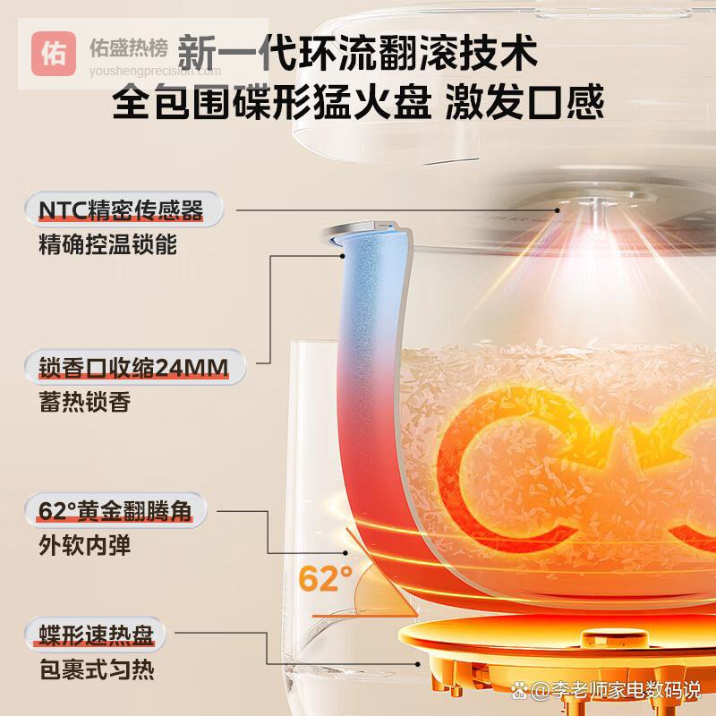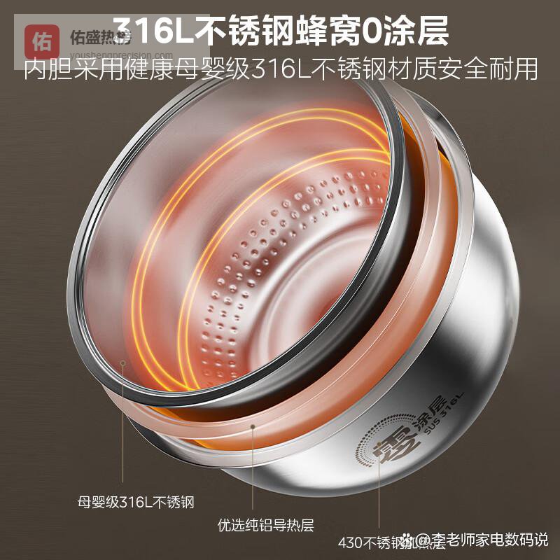 这款是“健康守护者”,为注重安全的家庭量身打造。5L大容量适合5-8人,煮饭煲汤全能应对。核心优势是0涂层设计,内胆用316L不锈钢一体成型,无化学涂层更安心,清洗时省心省力,长期用也不怕掉漆。IH加热技术火力均匀,米饭香甜不粘锅,搭配智能多功能,煮饭、炖肉、蒸菜样样行。健康档位还能做低糖饭,对控糖人群很友好。机身设计简约,嵌入橱柜或放台面都美观。目前有健康家电补贴,适合有小孩、老人或追求无添加的家庭。