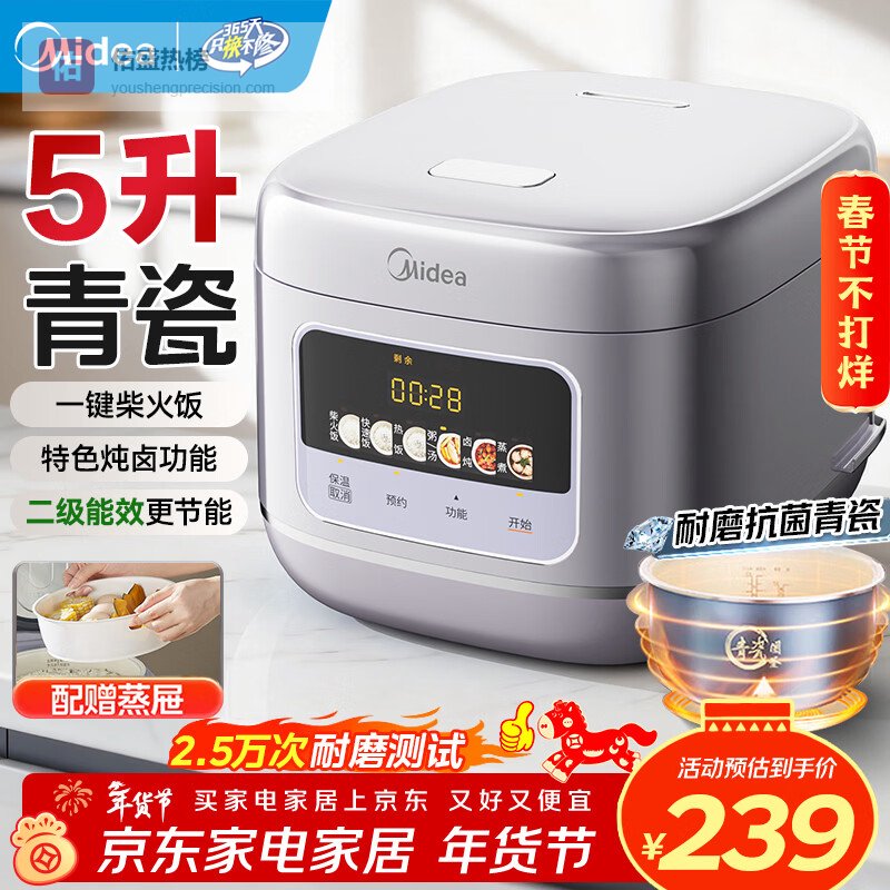 这款是“性价比小能手”,专攻大容量实用派。5L超大容量轻松搞定5-8人饭量,冬天煲一锅柴火饭满屋飘香。核心亮点是抗菌青瓷内胆+微压技术,内胆抗菌易清洗,微压锁水让米饭更软糯,22分钟快煮功能超救急,下班回家也能吃上热饭。功能上简单实用,柴火饭模式一键还原古早味,煮粥、煲汤不溢锅,智能预约睡前设置好,早餐粥自动煮好。机身轻巧不占地,适合租房党或老人操作。目前正值冬季促销,预算有限选它准没错。