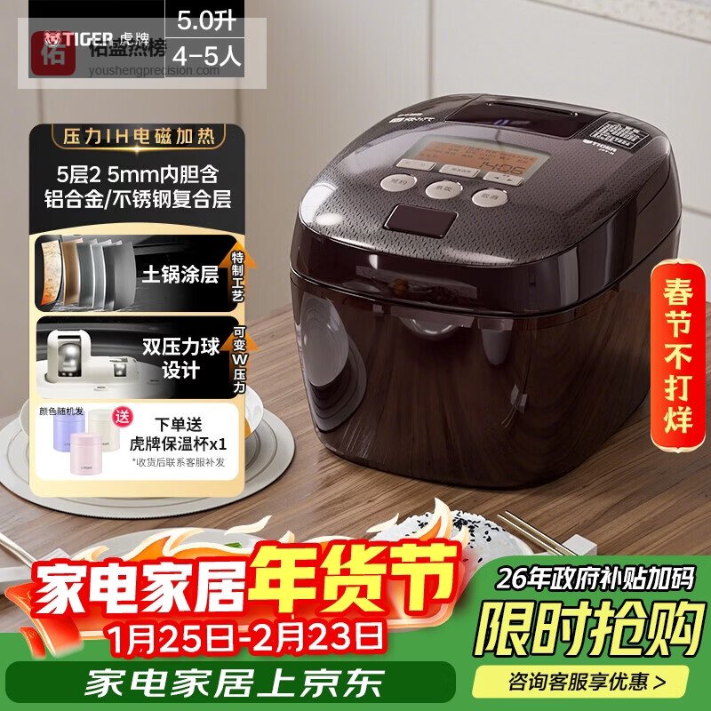 虎牌(TIGER)电饭煲Pro 智能压力IH日本进口土锅涂层压力电饭煲4-5人深棕色 5LJPT-H¥