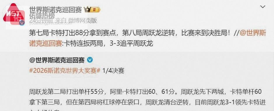 周跃龙此前四进排名赛决赛全部屈居亚军,这一次冲击首冠,他最缺的不是准度,而是把领先局面“拧死”的决心