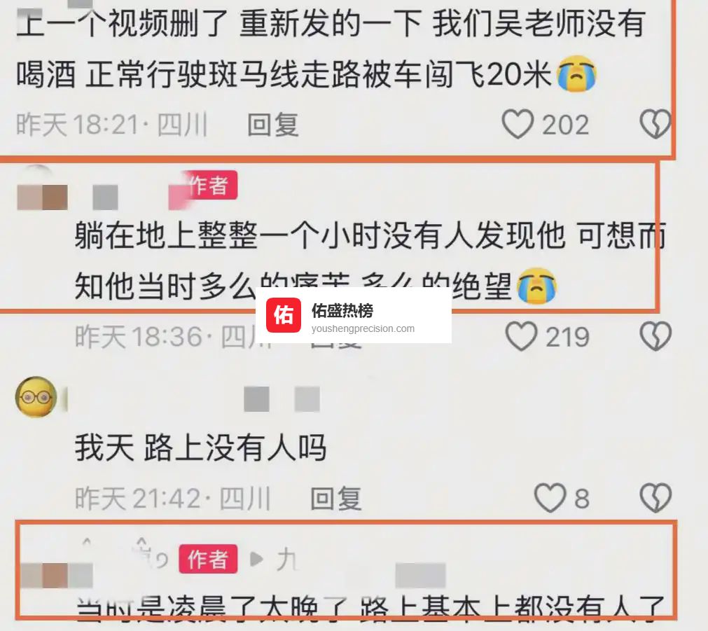 据了解,出事那晚,吴老师并没有喝酒。他正常走过斑马线时,被一辆车撞飞了20多米。因为事故发生在凌晨,天气又冷,路上几乎没有人。他就这样在地上躺了整整一个小时,才被人发现。