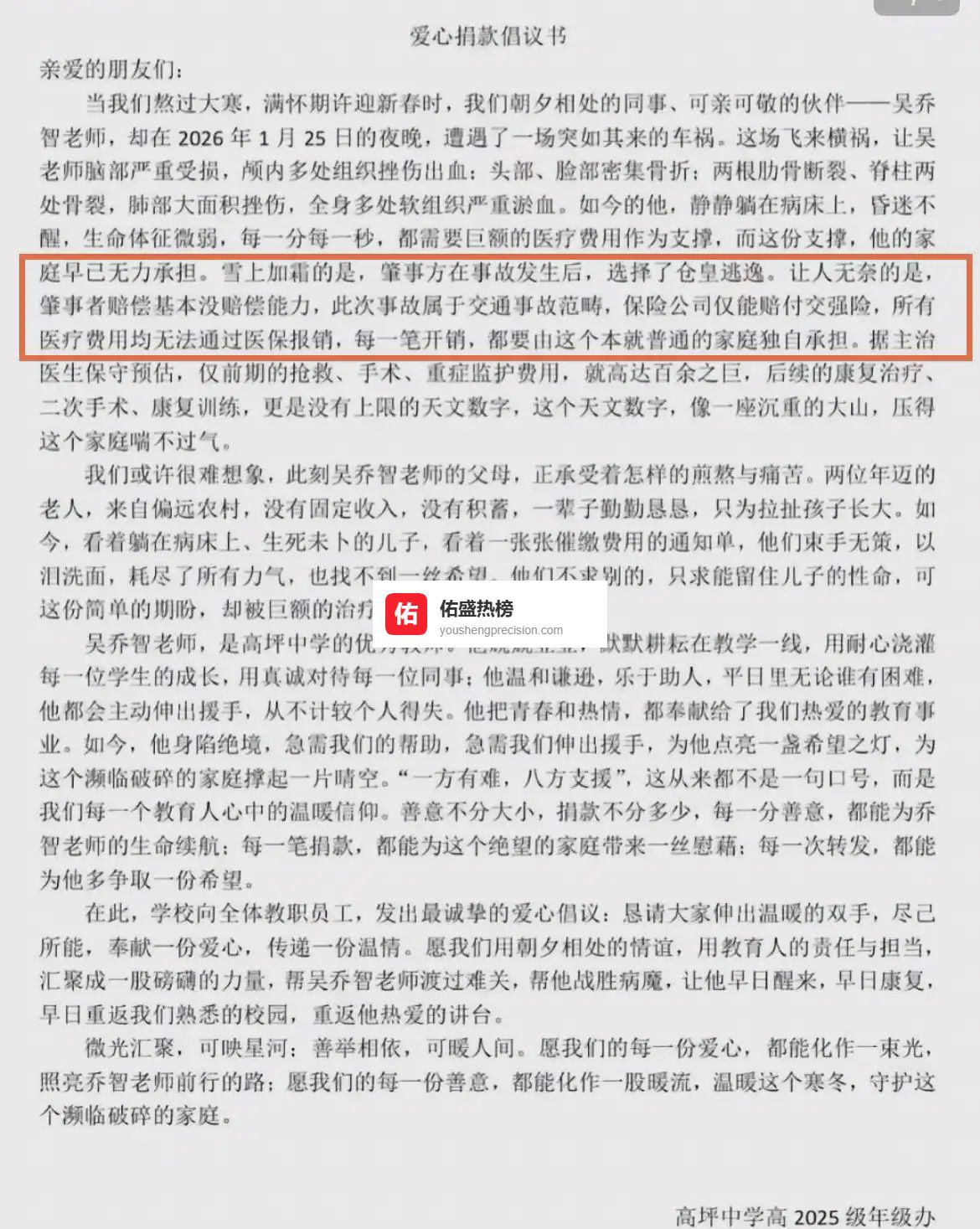 从那份捐款倡议书里可以看到,吴老师是在25号晚上出的车祸,头部伤得非常重。每一分钟的抢救,花费都像流水一样,家人早就撑不住了,这才发起了求助。虽然爱心不断汇聚,可最终还是没能留住他的生命。