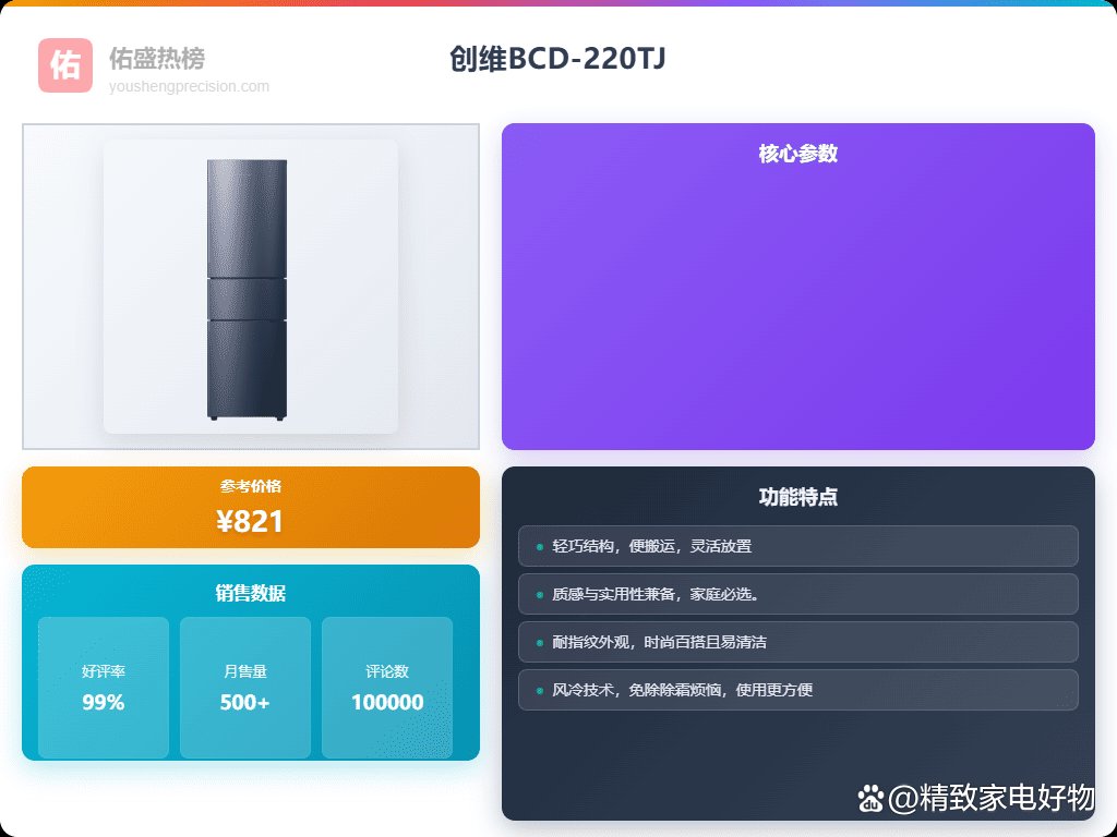 【紧凑大容量设计】宽度和深度都控制在60厘米以下,占地面积很小,放在租房或宿舍空间里面还不错。容量达到215升,可以轻松存够一家人的日常食材。整体设计简洁大气,易于清理,不会藏污垢,用着还挺方便的。