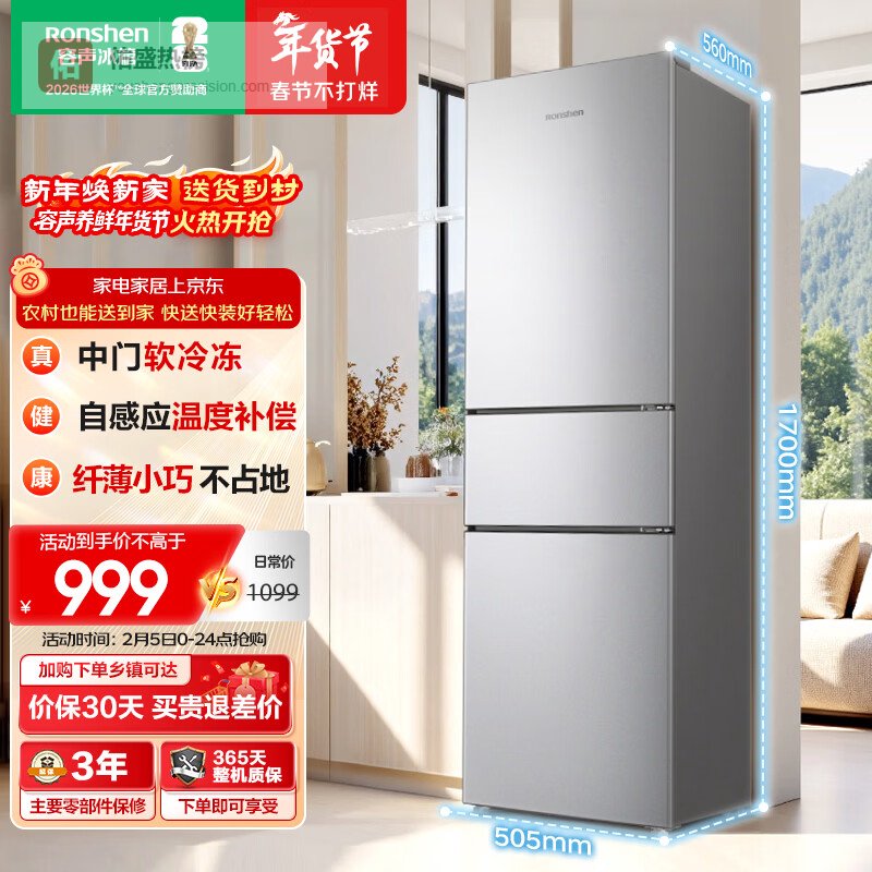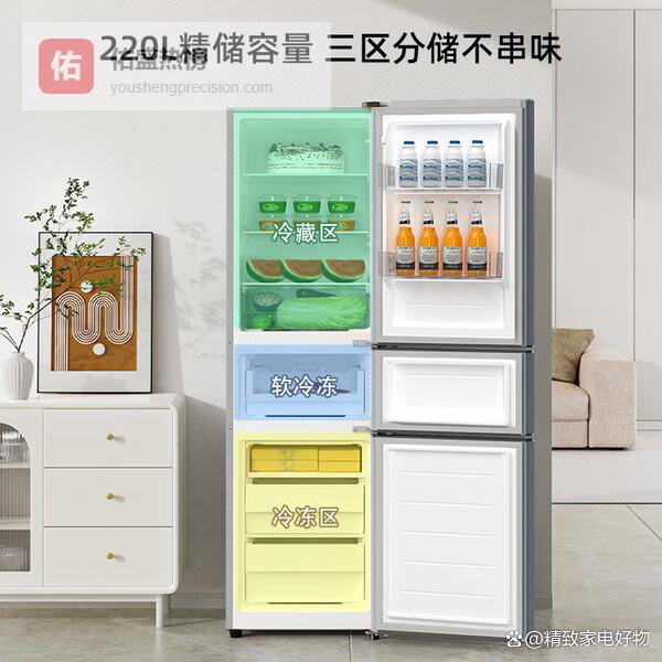 三、荣事达【三温区独立控温】这款荣事达三门冰箱带有冷藏、变温和冷冻三大区域,每个区域都能独立调节温度,用起来特别方便。比如你可以把蔬果放在冷藏区,把肉类放在软冷冻区,保证每样食材都能保持最佳新鲜度,不会串味。