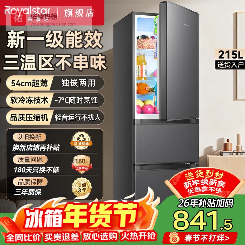 荣事达(Royalstar)215升三门冰箱家用大容量中小型三开门 节能低噪租房中门软冷冻超薄微霜低音保鲜电冰箱 以旧换新 215升【一级能效】两天一度电 钛深灰¥