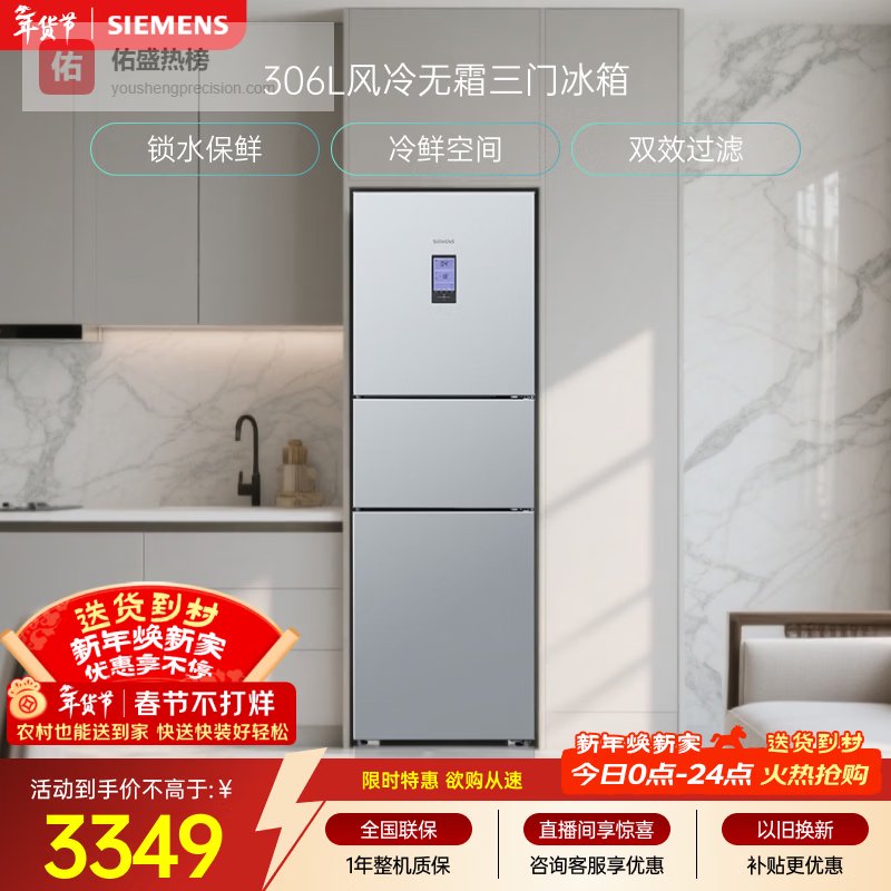西门子(SIEMENS)306L三门冰箱 小冰箱风冷无霜 锁水保鲜 冷鲜空间 双效过滤 KG32HA26EC 国家补贴¥