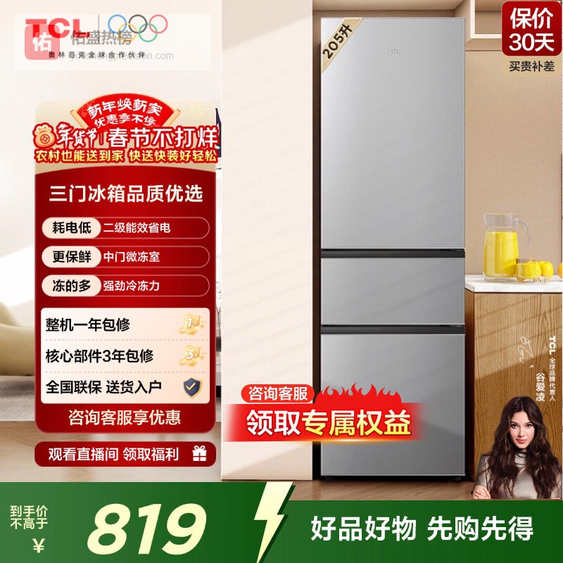 TCL 200+升三门三温区小冰箱 二级能效 节能养鲜 小型便捷租房迷你冰箱 以旧换新 【热销爆款】 鲜活三门冰箱¥