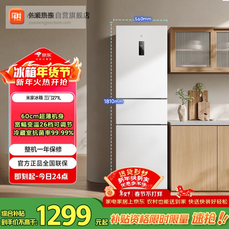 米家小米271L三门冰箱小型家用风冷无霜节能安静运行一级能效租房宿舍BCD-271WTMP国家补贴¥