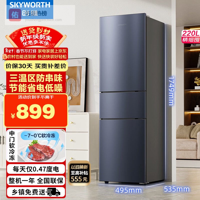 创维220升小冰箱 三门家用小型电冰箱 三门三温区中门软冷冻 保鲜省电低音BCD-220TJ暗夜蓝¥