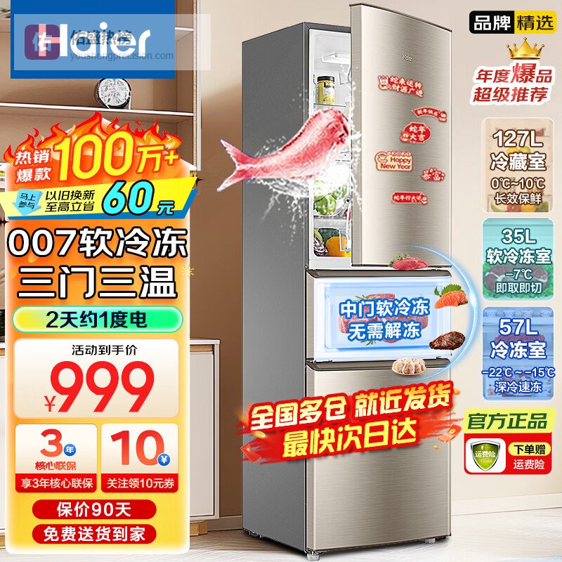 二、海尔【三门分类储存】这款海尔DEO冰箱采用了三门三温区设计,可以把不同的食材分类保存,避免串味,还能根据需要调节温度,保持食物新鲜又方便。无论是冷藏、软冷冻还是冷冻,每个区域都合理划分,用起来特别得心应手。
