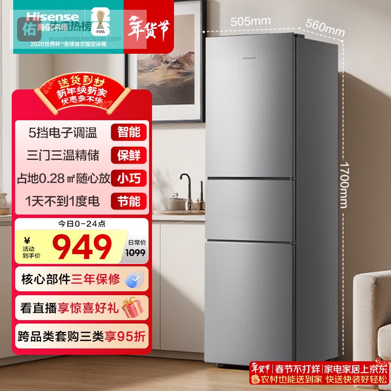 海信216L三门小冰箱二级能效直冷银色小户型软冷冻精储租房宿舍电冰箱BCD-216S1RNKQD¥