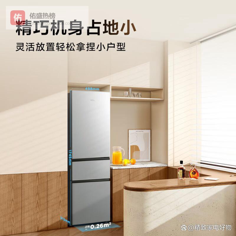 【紧凑轻巧占地少】冰箱整体占地才约0.26平方米,非常适合小户型或空间有限的家里。它的宽度仅495mm,重量轻到只有41公斤,搬动没有压力。运行噪音低至38dB,几乎听不到声音,挺静音的,用在卧室或者厨房都挺合适,生活不会打扰。