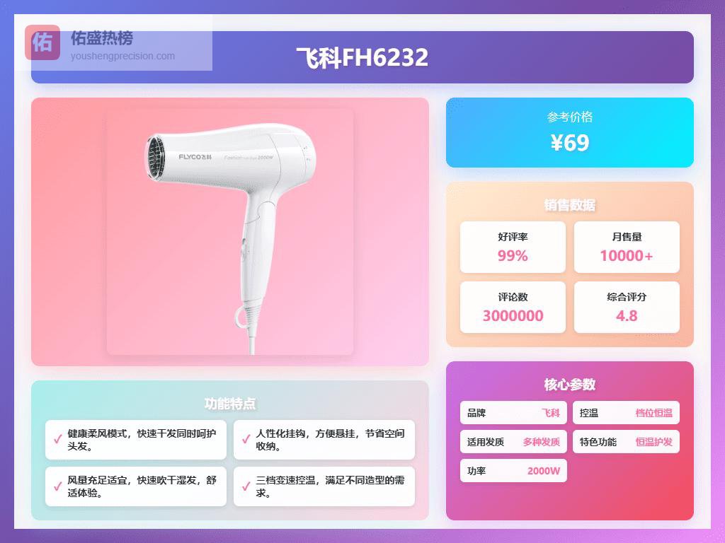 四、飞科▶ 强劲大功率:这款飞科FH6232电吹风拥有2000W的大功率,风力非常充足,吹干头发变得更快更省事。无论是日常用还是专业沙龙都挺合适,基本可以满足各种干发需求。
