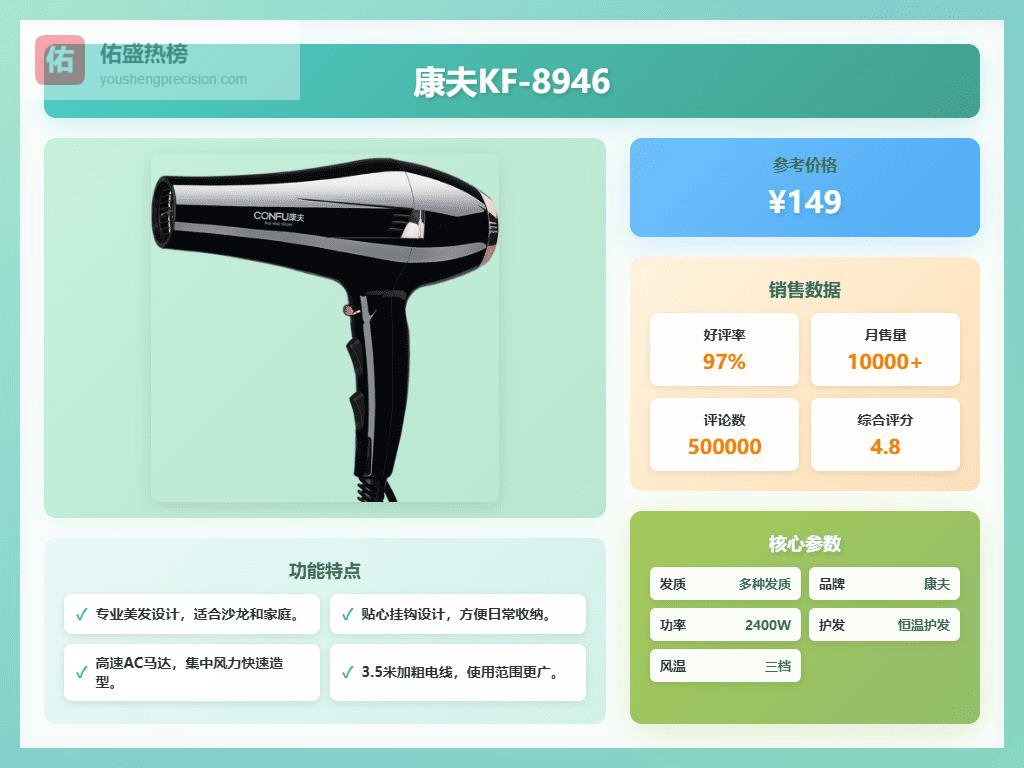 吹风机家用哪个牌子好安全,深入盘点推荐一、康夫▶ 强劲大功率:康夫KF-8946配备2400W大功率,风力十足,能快速把你的头发吹干,节省宝贵时间,不用等太久,特别适合繁忙的早晨或赶时间的时候用。