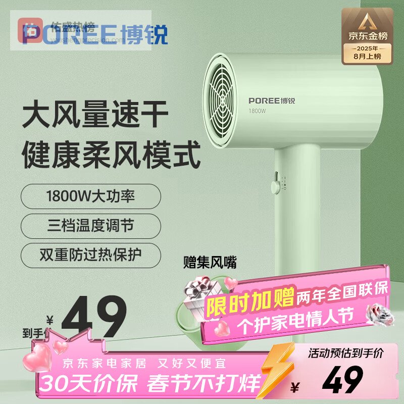 飞科(FLYCO)博锐电吹风机吹头发家用大功率不伤发便携护发吹风筒女士宿舍用 翡翠绿PH1628¥