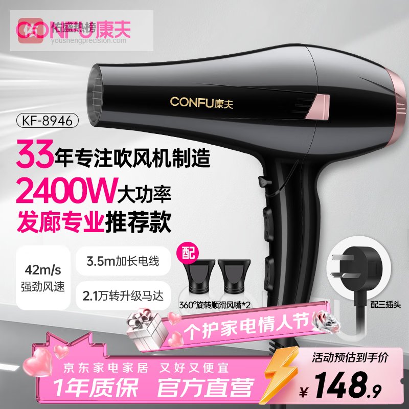 康夫(CONFU)电吹风机家用2400W大功率恒温护发大风力快速干发理发店发廊吹风筒KF-8946¥