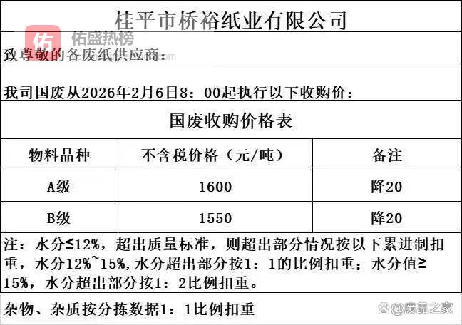 废品之家消息,2月6日起,广东东莞金洲纸业,废纸价格下调30元/吨。调整后执行到厂(反向开票)(含税)价:一级纸1680;二级纸1630;三级纸1580;一级坑卡1580;二级坑卡1530;三级坑卡1480;一级纸为纯黄工厂切边、纸板,工业回收的纸箱、大烟箱纸、纯黄大商场(大超市)纸等纯黄。备注:纸皮,杂纸比例10%-20%;二级纸为纯黄纸箱纸、超市纸皮、小商店纸皮、社会回收纸皮,杂纸比例,20%-50%,啤酒厂初次回收的纯啤酒箱、纯商业大张花纸皮;三级纸:杂纸比例50%-70%;一级坑卡:坑卡纸含量≥60%;二级坑卡:坑卡纸含量30%-60%;三级坑卡:坑卡纸含量10%-30%。2026年春节国废停开收时间通知如下: