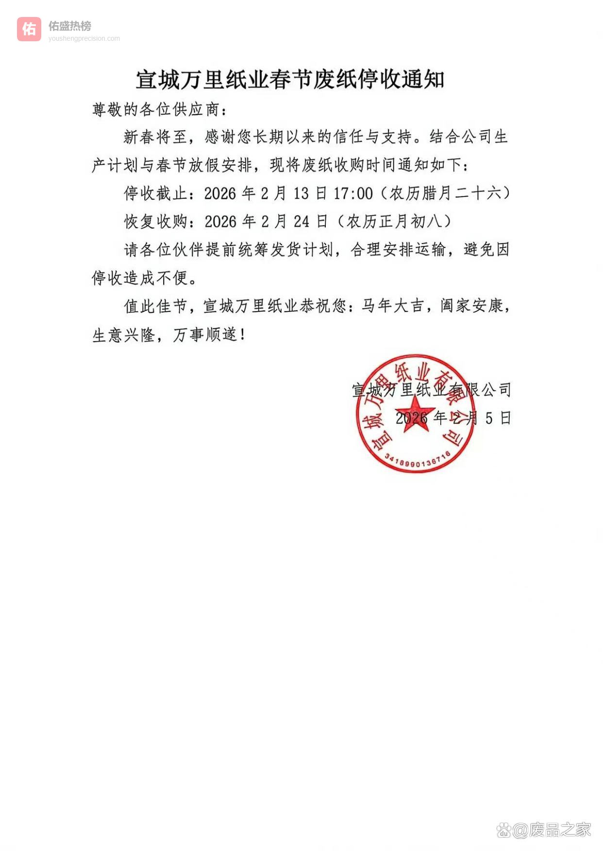 废品之家消息,2月13日起,安徽宣城万里纸业,春节废纸停收通知。