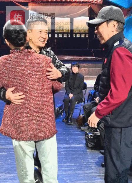 接着,阎维文老师也过来了,跟倪萍礼貌地抱了抱。阎老师保养得是真好啊,在人群里显得特精神。不过他好像跟春晚这拨人没那么熟,抱完就安静站在一边,有点“局外人”的感觉。