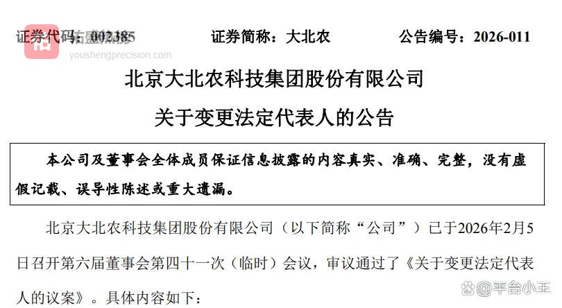 2月6日,北京大北农科技集团股份有限公司发布公告,宣布公司法定代表人已正式变更为邵丽君女士。这一高层变动于2月5日经公司第六届董事会第四十一次会议审议通过。
