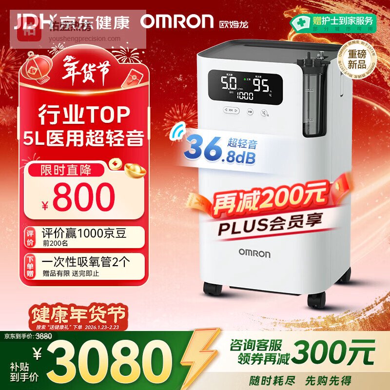 欧姆龙(OMRON)5L3L1L升制氧机家用老人医用级吸氧机轻音雾化氧气机Y-5103W年货¥