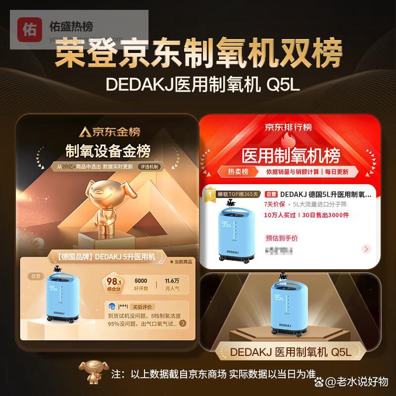 六、DEDAKJ 德迩杰Q5L搭载"智能氧疗"系统,获2026年德国红点奖,氧浓度稳定性标杆。 精准氧疗专家!实时监测血氧饱和度自动调节流量,记忆功能保存个性化设置。