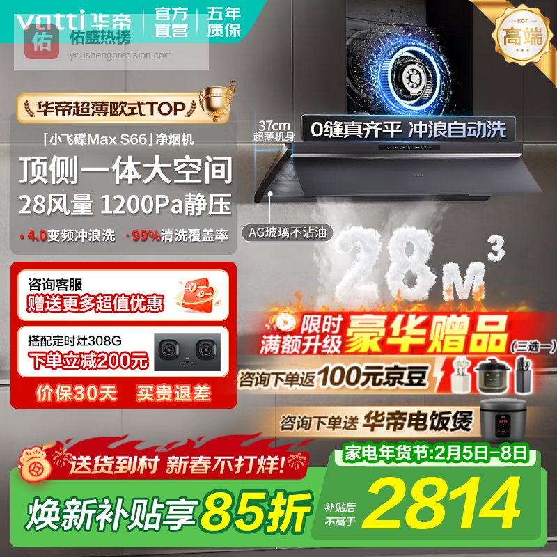 华帝油烟机【小飞碟MaxS66】顶侧一体吸抽油烟机超薄平嵌28大吸力家用自清洁一级能效上门安装国家补贴 【AG玻璃】S66 高端旗舰/28大风量¥