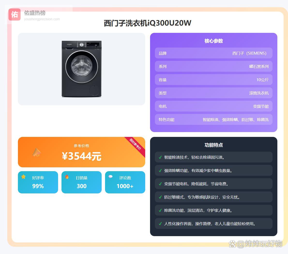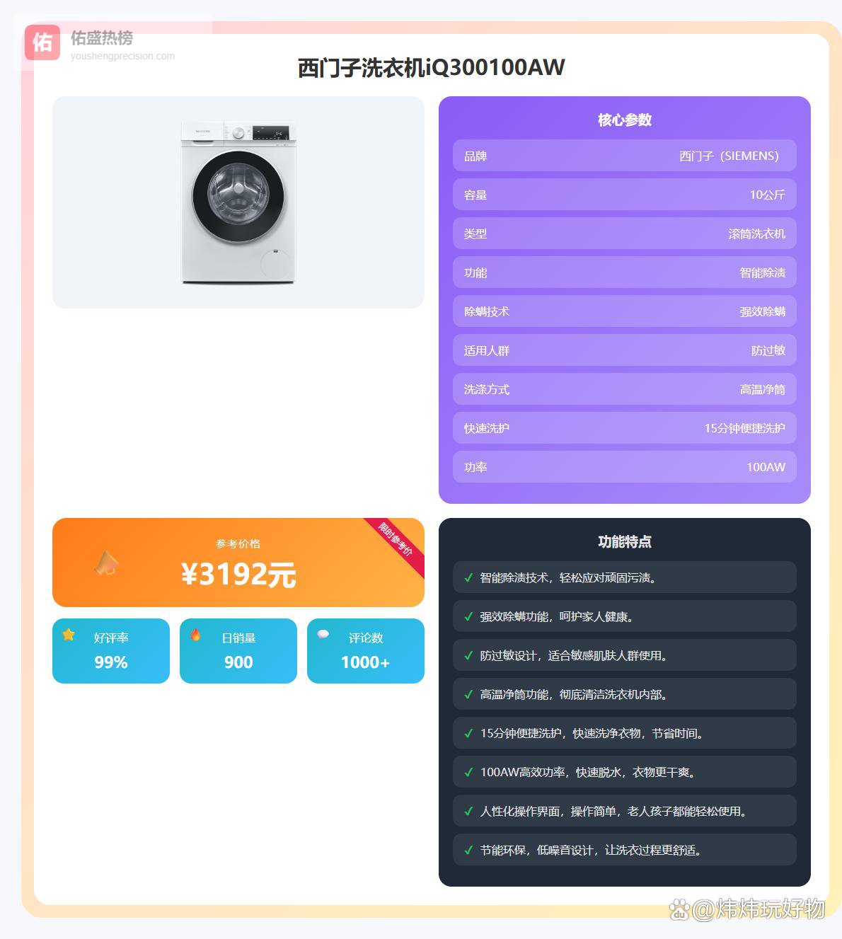 因此,当你在iQ300U20W和iQ300100AW之间纠结时,不必过于困扰。它们都代表了西门子iQ300系列里搭载智能投放的诚意之作。你可以把它们看作是同一款优秀产品的两个“皮肤”或“套装”,核心的洗衣体验是有保障的。根据眼缘和实惠度选就好。