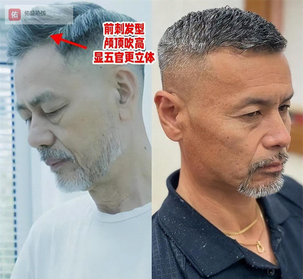 中年男士换发型不用太讲究,简单清爽就挺好,像这种利落的寸头或者前刺头,把头发剪短后特别容易收拾,把额头露出来,再把头顶吹蓬松些,还能让脸型更好看,五官也更显立体。