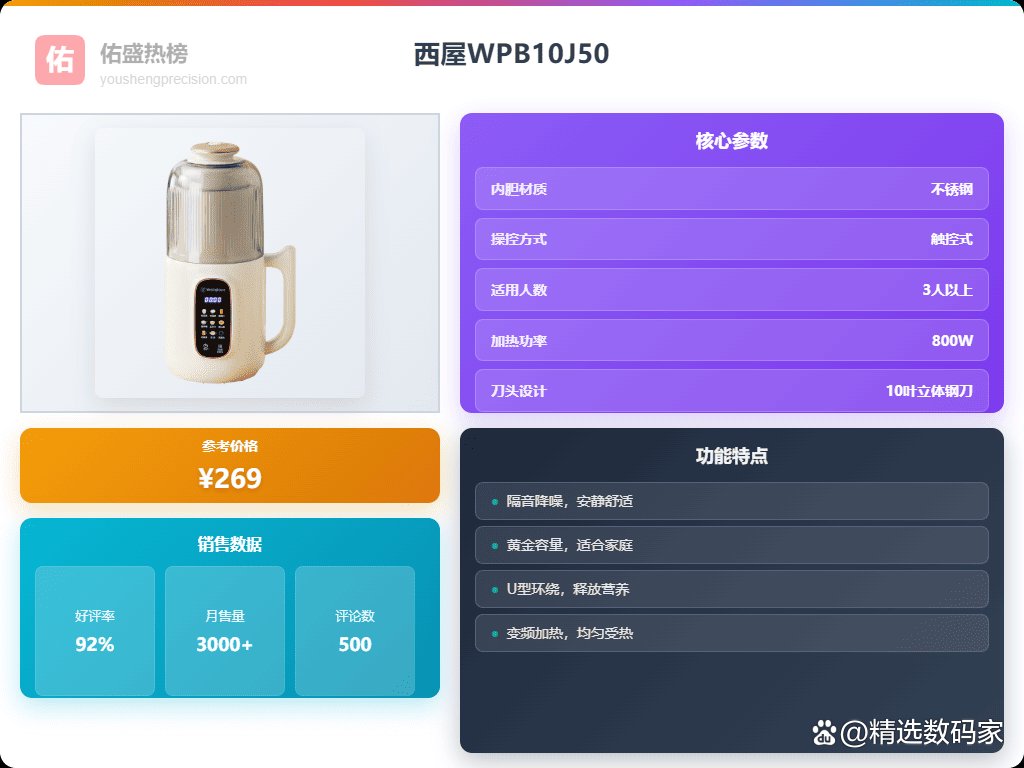 第3款:西屋WPB10J50特点:高速破壁、免滤豆浆、预约定时、多种模式