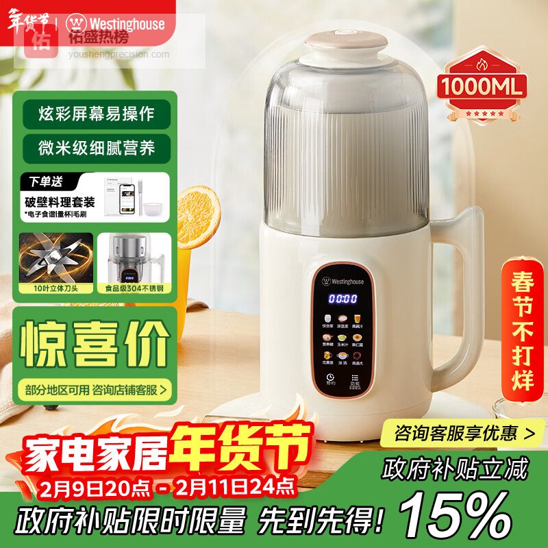 西屋(Westinghouse)不锈钢豆浆机小型迷你破壁机1L家用多功能料理机全自动免滤辅食机 WPB10J50¥