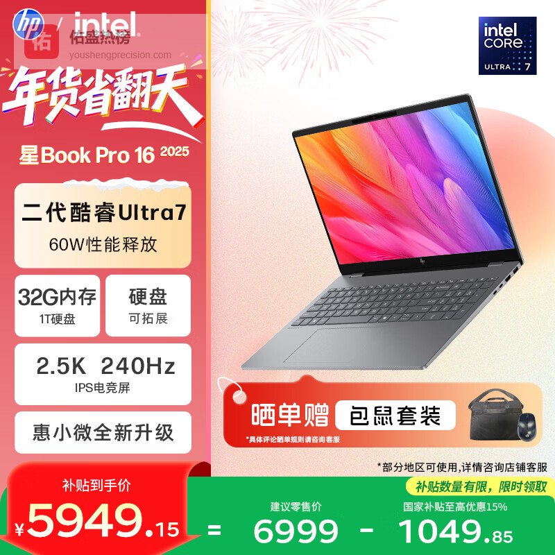 惠普HP【国家补贴】星Book Pro 16 2025 轻薄笔记本电脑(酷睿Ultra7 255H 32G 1T 2.5K 240Hz AI)灰¥