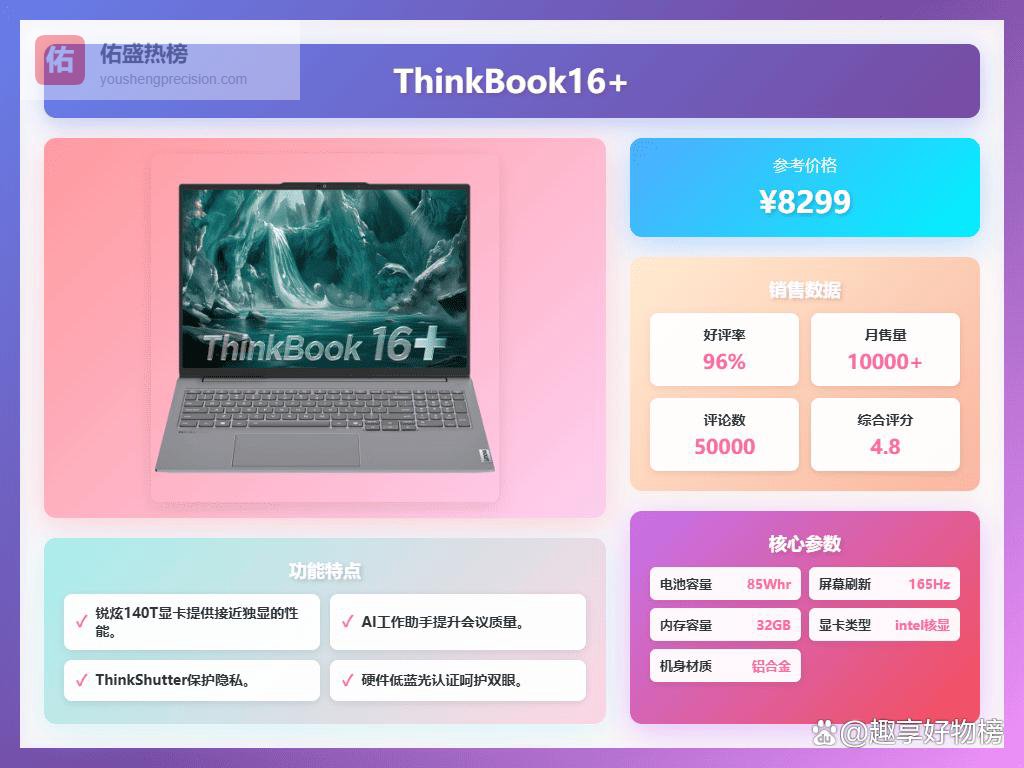 2026年适合计算机专业的4款笔记本:高效便携,介绍几个主流品牌一、ThinkPad这款ThinkPad ThinkBook 16+配备了英特尔酷睿Ultra2代处理器,三核异构设计包括6个性能核心,能应对日常办公和复杂任务,能效表现也挺不错。搭载的AI加速引擎让AI应用更高效,无论是创作还是智能辅助,都能体验到硬件的硬核支持。