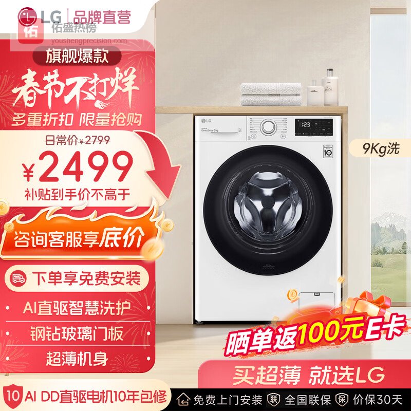 【品牌直营】LG9公斤滚筒洗衣机全自动475mm超薄机身AI直驱变频洗衣机家用小户型白FCY90N2¥