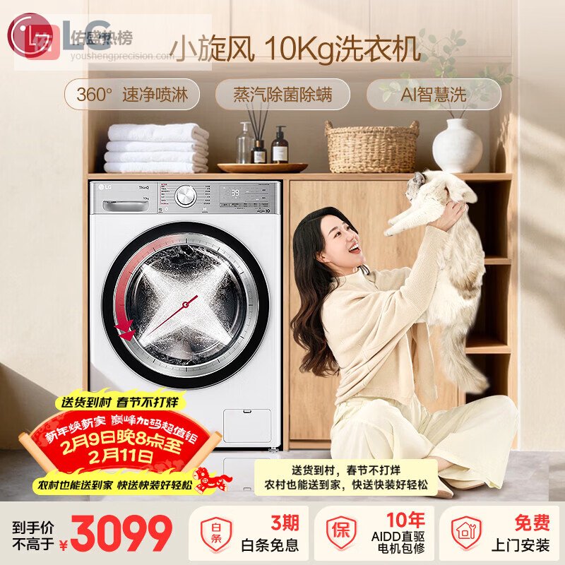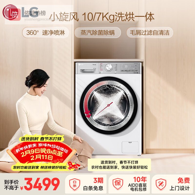 【京东自营】LG小旋风10KG全自动滚筒洗衣机带烘干一体360°速净喷淋蒸汽除菌螨AI直驱智慧洗FC¥