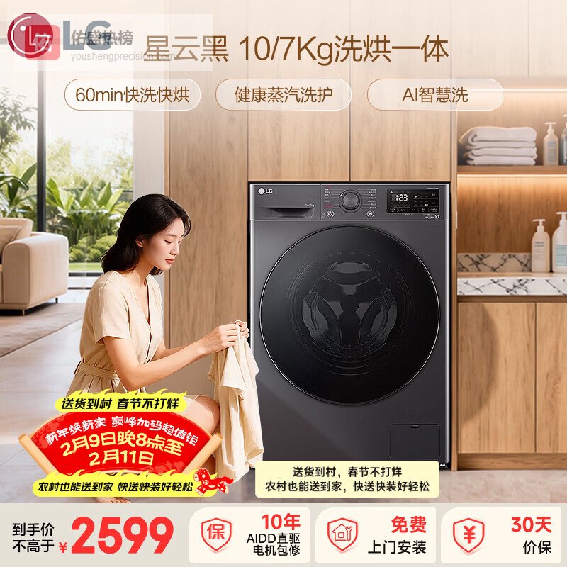【京东自营】LG星云黑10KG全自动洗衣机带烘干一体超薄滚筒洗烘健康蒸汽除菌AI直驱变频AI智慧洗F¥