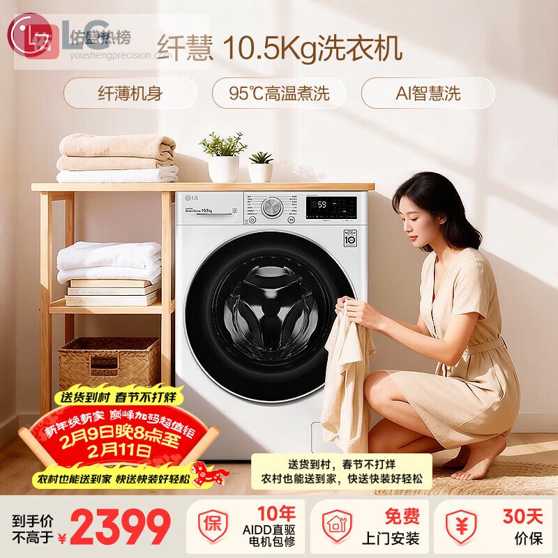 【京东自营】LG纤慧10.5KG全自动滚筒洗衣机超薄家用大容量AI直驱变频95°高温煮洗FLX10N¥