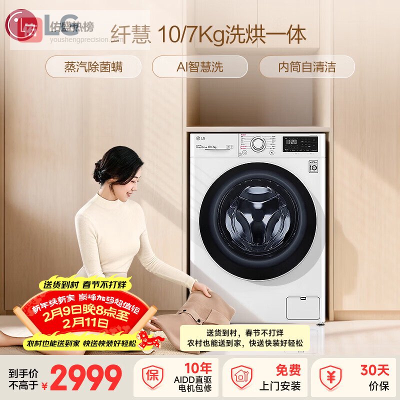 【京东自营】LG纤慧10KG全自动滚筒洗衣机带烘干一体家用大容量蒸汽除菌螨直驱变频电机蒸汽清新FCY¥