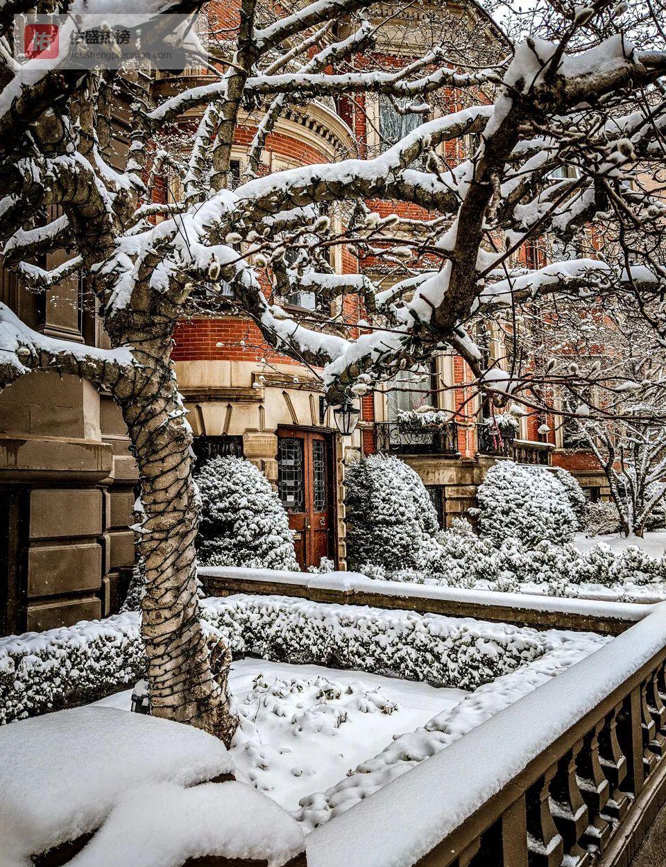 查尔斯街像一条柔软的丝带,把波士顿公共广场与公共花园紧紧系在一起。新雪初霁,踩在松软的白色地毯上,两侧高耸的棕色石墙把镜头瞬间拉进19世纪的怀旧氛围。
