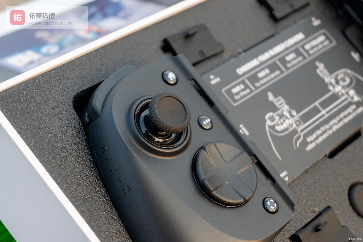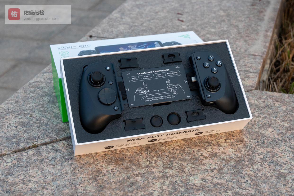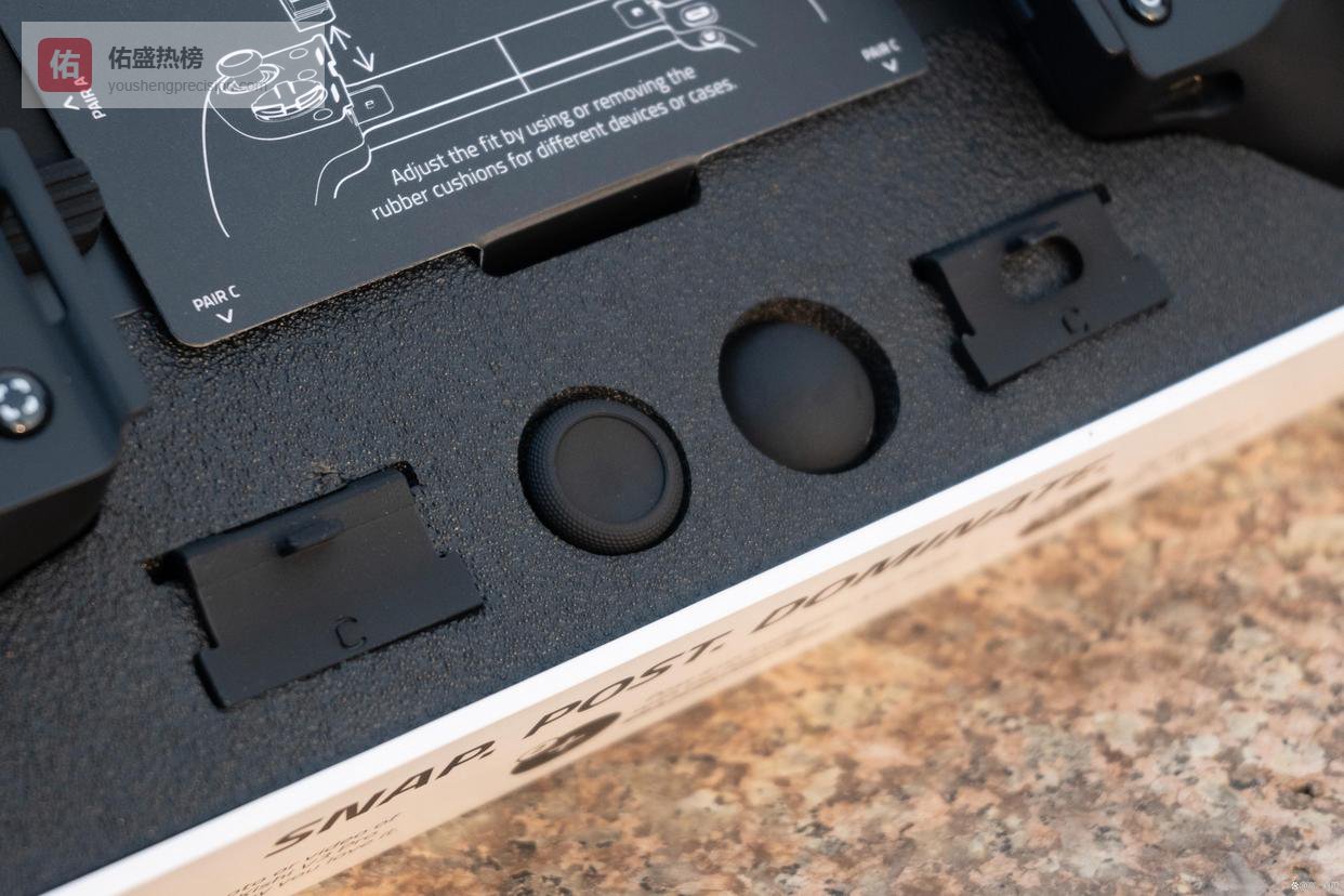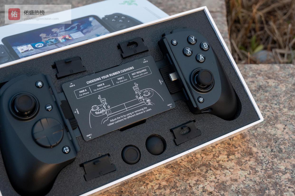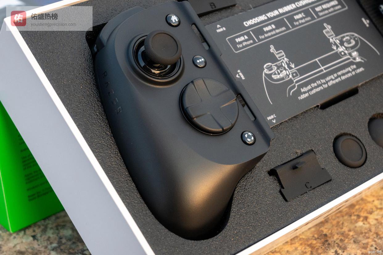 首先是经典的雷蛇绿白配色包装,打开包装盒除了手柄外,给到了内凹和外凸的蘑菇头各一个,以及两套能夹持不同厚度平板、手机的橡胶垫片,保证了拉伸手柄的兼容性。