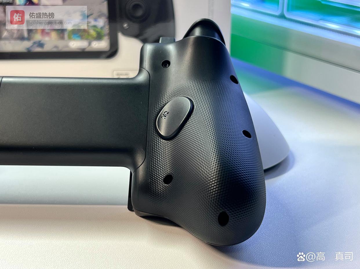 拉伸手柄本体乍一眼看上去像是一个完整手柄被劈开的样子,夹持手机后握在手里的感觉你还别说真有点像在玩steamdeck,尤其是非常接近掌机的键位布局。V3Pro的两个握把设计厚实饱满,底部基于塑料外壳还做了点状防滑纹,握持手感很舒服,不像握steamdeck像在半捏着掌机握把一样,V3Pro还是比较接近正常手柄的握持体验。