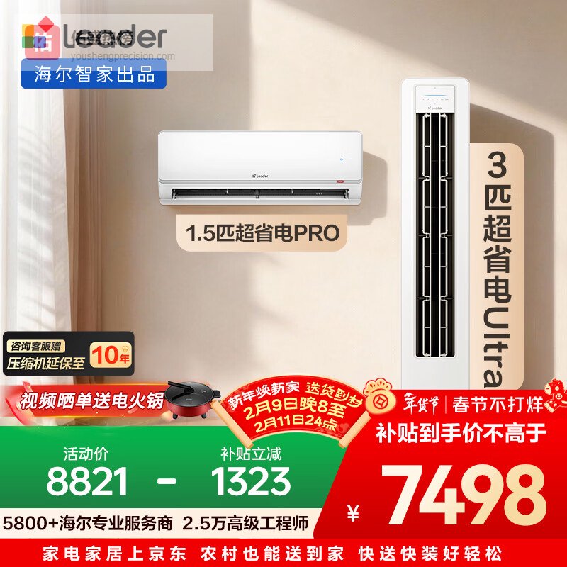 海尔出品统帅空调 超省电大双排神机 超一级能效一室一厅空调套装卧室客厅 3匹柜机Ultra+1.5匹挂机Pro¥
