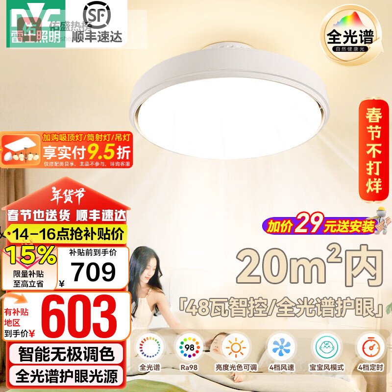 雷士(NVC)无叶风扇灯 隐形吊扇灯客厅卧室餐厅儿童房 宝宝风 舒适光 送遥控 荐!Pro智能48W/全光谱/宝宝风¥
