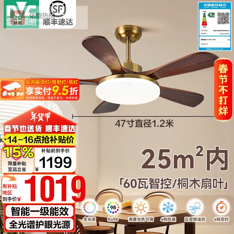 雷士(NVC)风扇灯 新中式吊扇灯中古风 餐厅客厅高显指吊灯遥控一级能效省电 似锦5叶/47寸60W全光谱/智控款¥