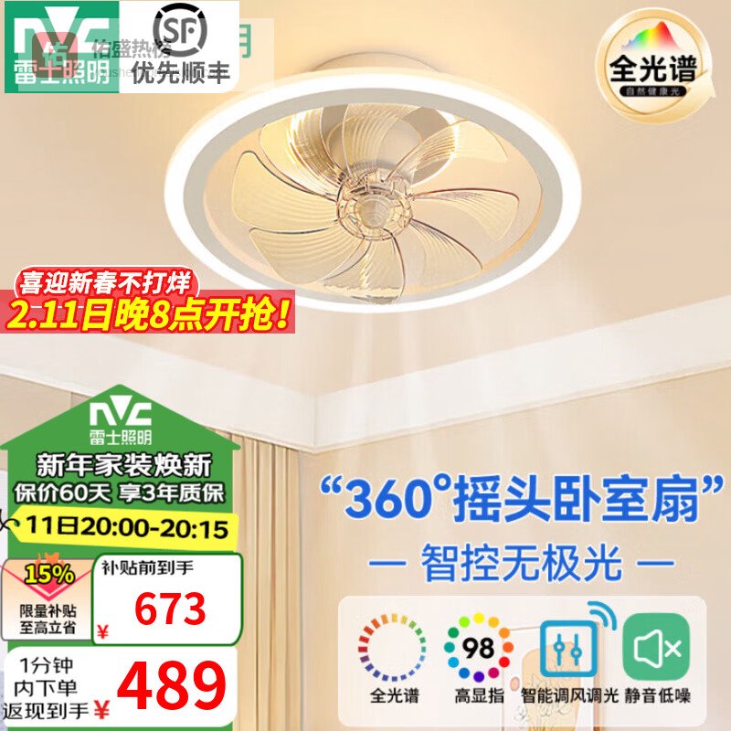 雷士(NVC)风扇灯北欧简约超薄吸顶灯带风扇客厅餐厅卧室房间遥控吊扇灯 【全光谱】皎月白36W丨智控摇头¥
