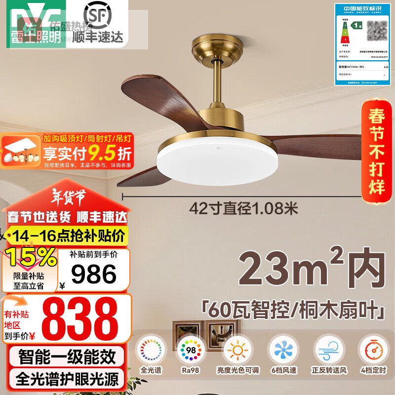 雷士(NVC)风扇灯 新中式吊扇灯中古风 餐厅客厅高显指吊灯遥控一级能效省电 似锦3叶/42寸60W全光谱/智控款¥